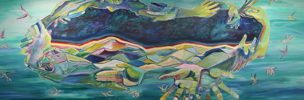 A closer look at the hands, mountains, birds, and night sky of Ivan’s mural.