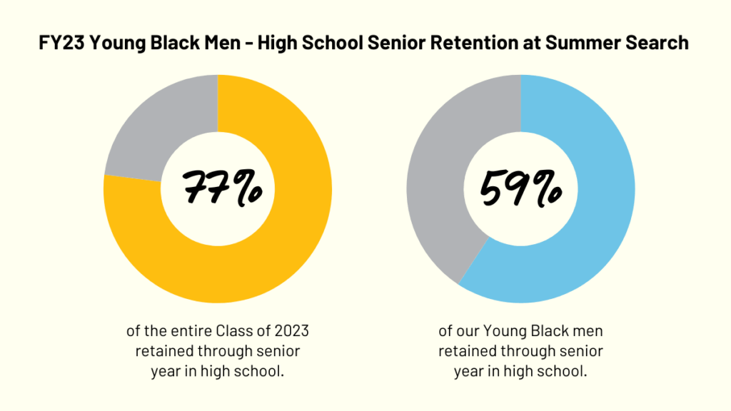 - 59% of our high school seniors who are young Black men actually stay with our program from multiple years (vs. 74% young Black women and 77% retention of all races/genders, as mentioned above).