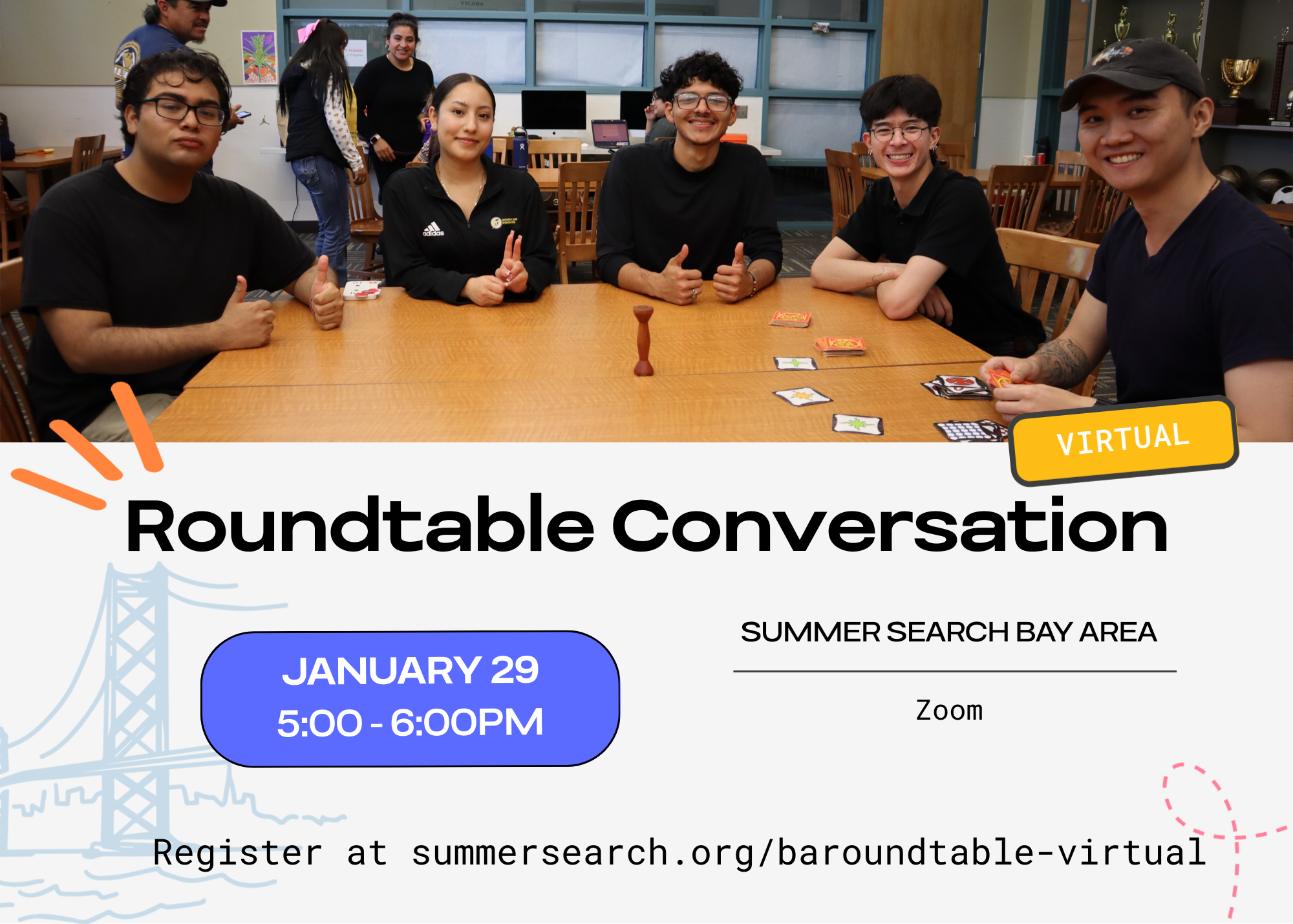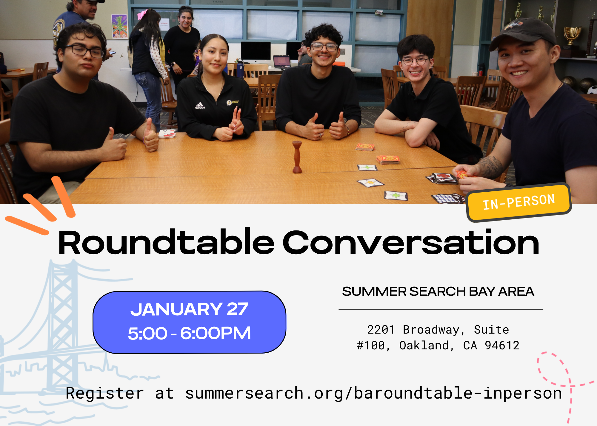 Summer Search Bay AreaWe invite you to join us in-person for our next Roundtable Conversation, focused on the mentor/mentee relationship in action. This conversation will feature one of our dedicated Summer Search mentors alongside a first-year postsecondary Summer Searcher, offering an honest, reflective look at how this partnership evolves, what it takes to build trust, and why sustained mentorship matters.